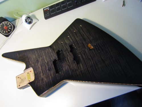 However, I’ve just picked up a neck and body on eBay for a bargain £122. It’s an explorer shape four string with a beautiful quilted maple top and overdie finish. It’s amazingly well built even if the shape is not to my personal taste (normally I lay Fender inspired Sadowsky basses), but at the price it was too good to pass up. The original cost of the neck and body was £1100 including taxes and shipping. The instrument had been built up using pro parts by a luthier in Bolton for a guy in Rugby. The recipient couldn’t get on with the lack of cut away to access the dusty end of the neck and stripped the bass of it’s hardware and electronics and had a new body and neck built. The total cost for the original bass was a few pounds short of £1800. Hopefully I’m going to pick up all the bits used to save some money. As for how much it’s going to cost who knows. What I can say is that I will only be using top shelf parts and building a stripped down passive rock machine;)